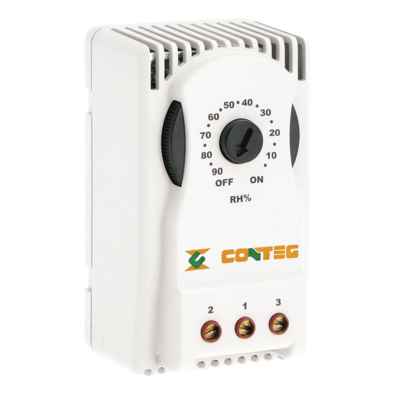 A humidistat is a device that switches on heating units, fans or heat exchangers when the preset relative humidity value is exceeded to prevent moisture condensation inside the cabinet.